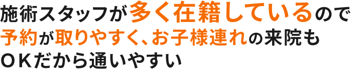 予約優先制のため待ち時間がほとんどございません。さらに予約が取れないといったことが無いように、施術スタッフも多数在籍しております。
