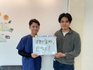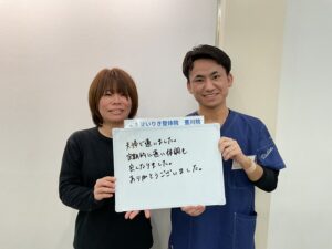 2~3日しても治らなかったため、本院に来てみると、30分程度の施術で痛みが嘘のように消えました。
