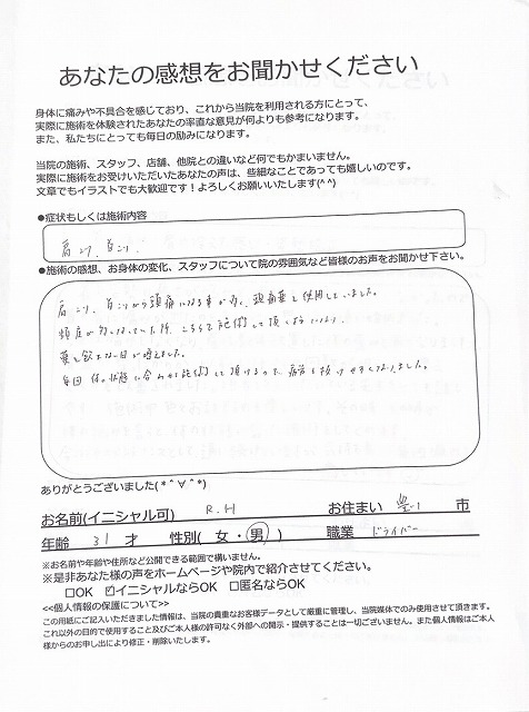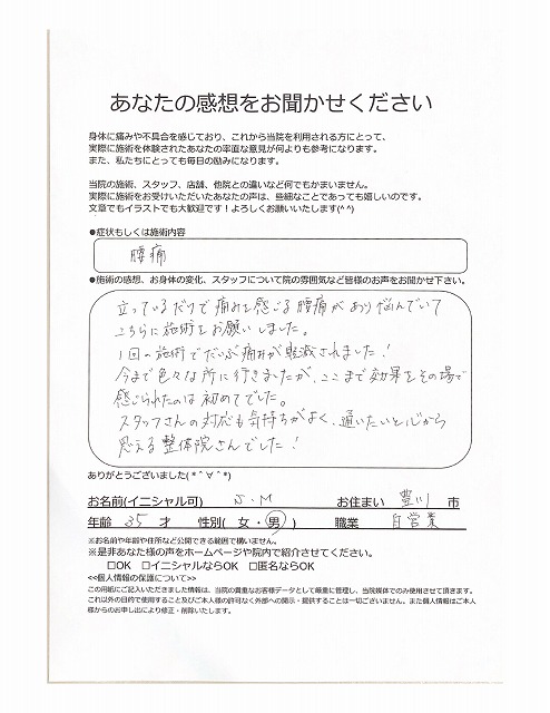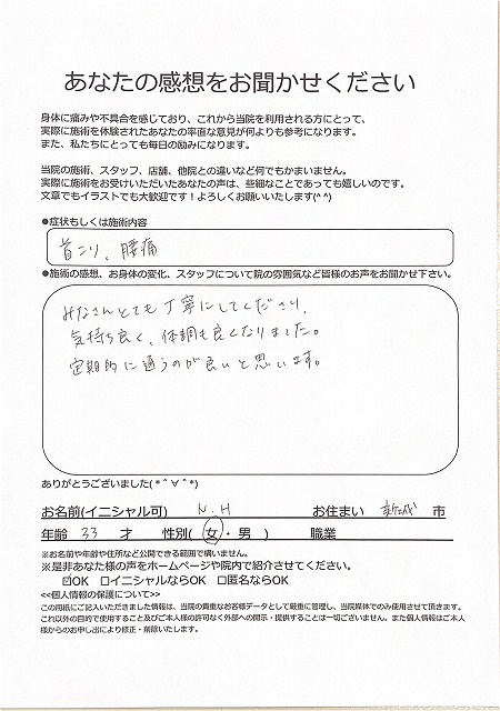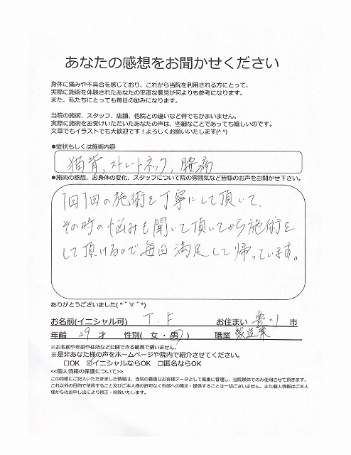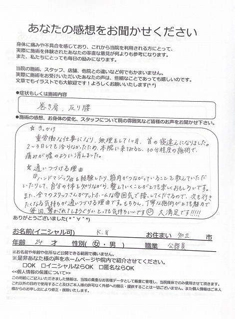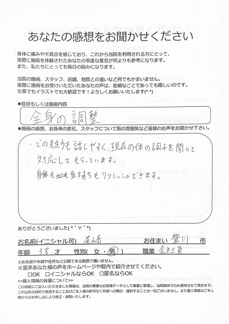 ・施術の感想、お身体の変化、スタッフについて院の雰囲気など皆様のお声をお聞かせ下さい。