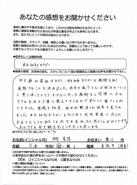 向き癖が最初はひどく、ゆるbabyセラピーの施術を知り通院することを決めました。
