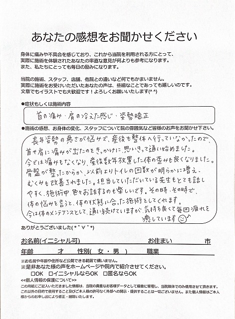 首の痛み・肩の冷えた感じ・姿勢矯正